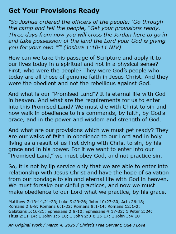 My name is Sue J Love. I am married. My husband Rick and I have 4 children and 3 children-in-law and 14 grandchildren. I have been a full-time homemaker most of our married lives, and I have been in Christian ministry most of that time, as well. I started teaching the Bible when I was a teenager, and I have taught children, youth, and women most of my adult life. Since late in 2004 the Lord Jesus has had me writing out what he teaches me through his word and posting it on the Internet, which I have been doing full-time since 2006. He also has given me multiple songs to write, which he sometimes includes in these writings. All praise to Him! View all posts by Sue Love