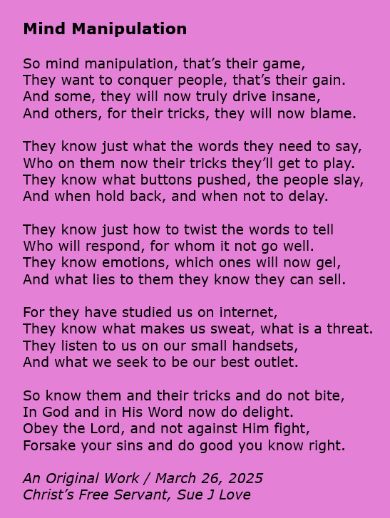 My name is Sue J Love. I am married. My husband Rick and I have 4 children and 3 children-in-law and 14 grandchildren. I have been a full-time homemaker most of our married lives, and I have been in Christian ministry most of that time, as well. I started teaching the Bible when I was a teenager, and I have taught children, youth, and women most of my adult life. Since late in 2004 the Lord Jesus has had me writing out what he teaches me through his word and posting it on the Internet, which I have been doing full-time since 2006. He also has given me multiple songs to write, which he sometimes includes in these writings. All praise to Him! View all posts by Sue Love