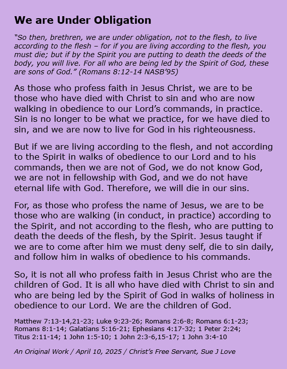 My name is Sue J Love. I am married. My husband Rick and I have 4 children and 3 children-in-law and 14 grandchildren. I have been a full-time homemaker most of our married lives, and I have been in Christian ministry most of that time, as well. I started teaching the Bible when I was a teenager, and I have taught children, youth, and women most of my adult life. Since late in 2004 the Lord Jesus has had me writing out what he teaches me through his word and posting it on the Internet, which I have been doing full-time since 2006. He also has given me multiple songs to write, which he sometimes includes in these writings. All praise to Him! View all posts by Sue Love