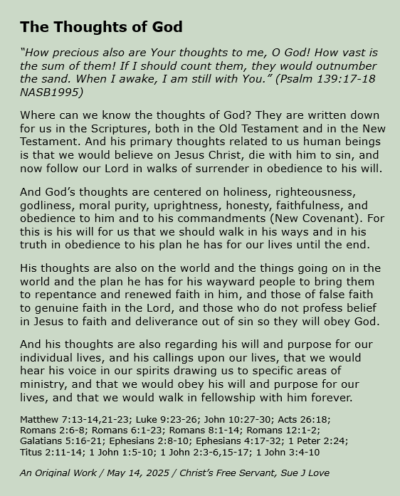 My name is Sue J Love. I am married. My husband Rick and I have 4 children and 3 children-in-law and 14 grandchildren. I have been a full-time homemaker most of our married lives, and I have been in Christian ministry most of that time, as well. I started teaching the Bible when I was a teenager, and I have taught children, youth, and women most of my adult life. Since late in 2004 the Lord Jesus has had me writing out what he teaches me through his word and posting it on the Internet, which I have been doing full-time since 2006. He also has given me multiple songs to write, which he sometimes includes in these writings. All praise to Him! View all posts by Sue Love