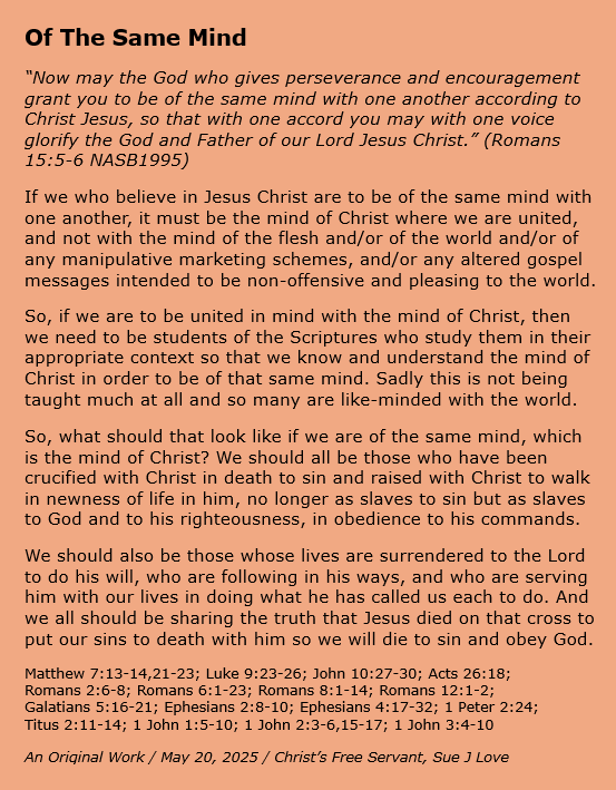 My name is Sue J Love. I am married. My husband Rick and I have 4 children and 3 children-in-law and 14 grandchildren. I have been a full-time homemaker most of our married lives, and I have been in Christian ministry most of that time, as well. I started teaching the Bible when I was a teenager, and I have taught children, youth, and women most of my adult life. Since late in 2004 the Lord Jesus has had me writing out what he teaches me through his word and posting it on the Internet, which I have been doing full-time since 2006. He also has given me multiple songs to write, which he sometimes includes in these writings. All praise to Him! View all posts by Sue Love