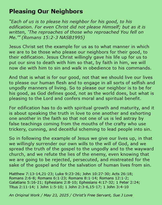 My name is Sue J Love. I am married. My husband Rick and I have 4 children and 3 children-in-law and 14 grandchildren. I have been a full-time homemaker most of our married lives, and I have been in Christian ministry most of that time, as well. I started teaching the Bible when I was a teenager, and I have taught children, youth, and women most of my adult life. Since late in 2004 the Lord Jesus has had me writing out what he teaches me through his word and posting it on the Internet, which I have been doing full-time since 2006. He also has given me multiple songs to write, which he sometimes includes in these writings. All praise to Him! View all posts by Sue Love