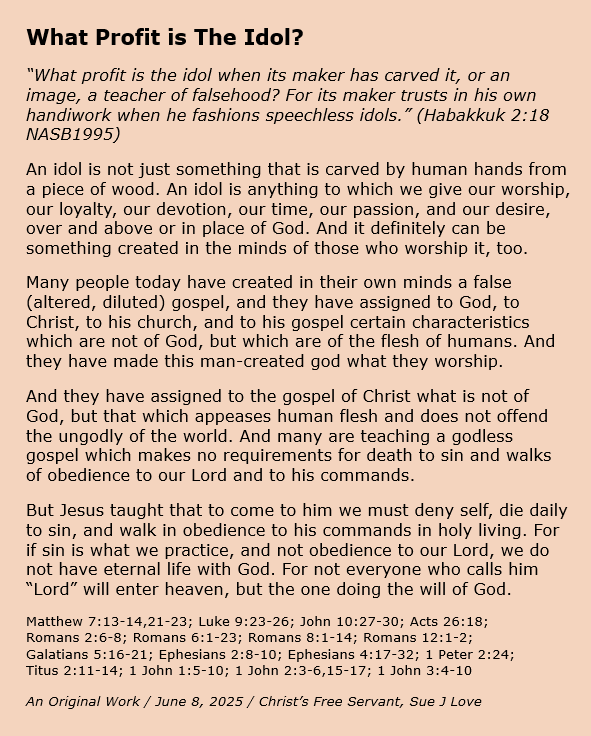 My name is Sue J Love. I am married. My husband Rick and I have 4 children and 3 children-in-law and 14 grandchildren. I have been a full-time homemaker most of our married lives, and I have been in Christian ministry most of that time, as well. I started teaching the Bible when I was a teenager, and I have taught children, youth, and women most of my adult life. Since late in 2004 the Lord Jesus has had me writing out what he teaches me through his word and posting it on the Internet, which I have been doing full-time since 2006. He also has given me multiple songs to write, which he sometimes includes in these writings. All praise to Him! View all posts by Sue Love