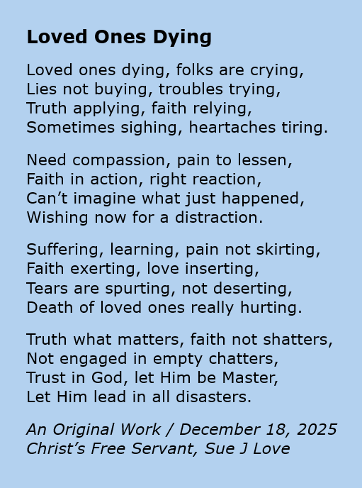 My name is Sue J Love. I am married. My husband Rick and I have 4 children and 3 children-in-law and 14 grandchildren. I have been a full-time homemaker most of our married lives, and I have been in Christian ministry most of that time, as well. I started teaching the Bible when I was a teenager, and I have taught children, youth, and women most of my adult life. Since late in 2004 the Lord Jesus has had me writing out what he teaches me through his word and posting it on the Internet, which I have been doing full-time since 2006. He also has given me multiple songs to write, which he sometimes includes in these writings. All praise to Him!