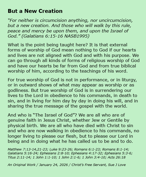 My name is Sue J Love. I am married. My husband Rick and I have 4 children and 3 children-in-law and 14 grandchildren. I have been a full-time homemaker most of our married lives, and I have been in Christian ministry most of that time, as well. I started teaching the Bible when I was a teenager, and I have taught children, youth, and women most of my adult life. Since late in 2004 the Lord Jesus has had me writing out what he teaches me through his word and posting it on the Internet, which I have been doing full-time since 2006. He also has given me multiple songs to write, which he sometimes includes in these writings. All praise to Him!