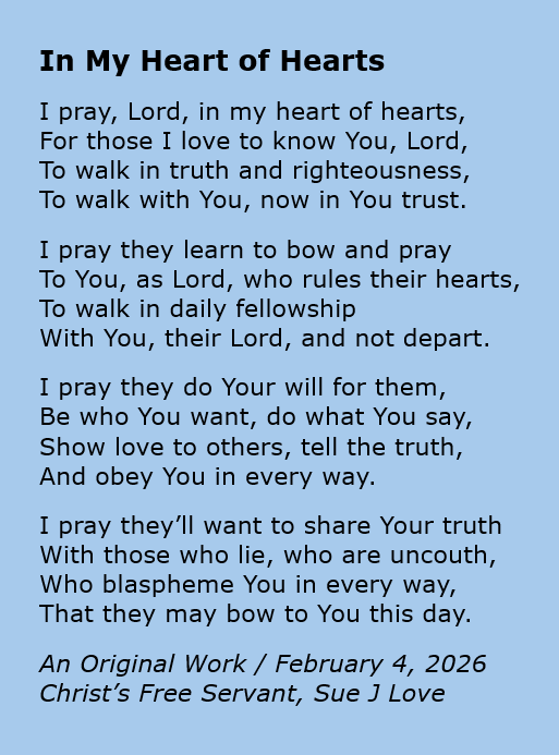 My name is Sue J Love. I am married. My husband Rick and I have 4 children and 3 children-in-law and 14 grandchildren. I have been a full-time homemaker most of our married lives, and I have been in Christian ministry most of that time, as well. I started teaching the Bible when I was a teenager, and I have taught children, youth, and women most of my adult life. Since late in 2004 the Lord Jesus has had me writing out what he teaches me through his word and posting it on the Internet, which I have been doing full-time since 2006. He also has given me multiple songs to write, which he sometimes includes in these writings. All praise to Him!