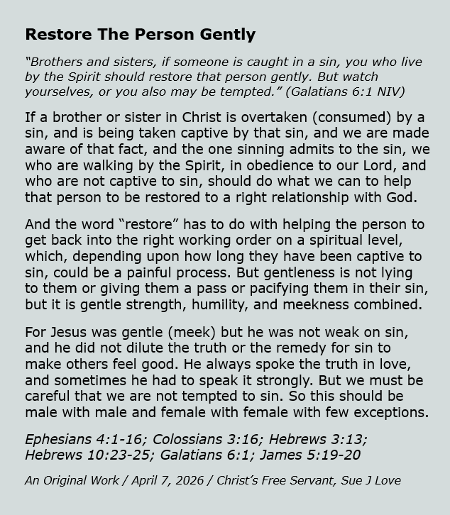 My name is Sue J Love. I am married. My husband Rick and I have 4 children and 3 children-in-law and 14 grandchildren. I have been a full-time homemaker most of our married lives, and I have been in Christian ministry most of that time, as well. I started teaching the Bible when I was a teenager, and I have taught children, youth, and women most of my adult life. Since late in 2004 the Lord Jesus has had me writing out what he teaches me through his word and posting it on the Internet, which I have been doing full-time since 2006. He also has given me multiple songs to write, which he sometimes includes in these writings. All praise to Him! View all posts by Sue Love